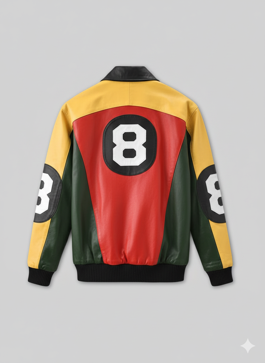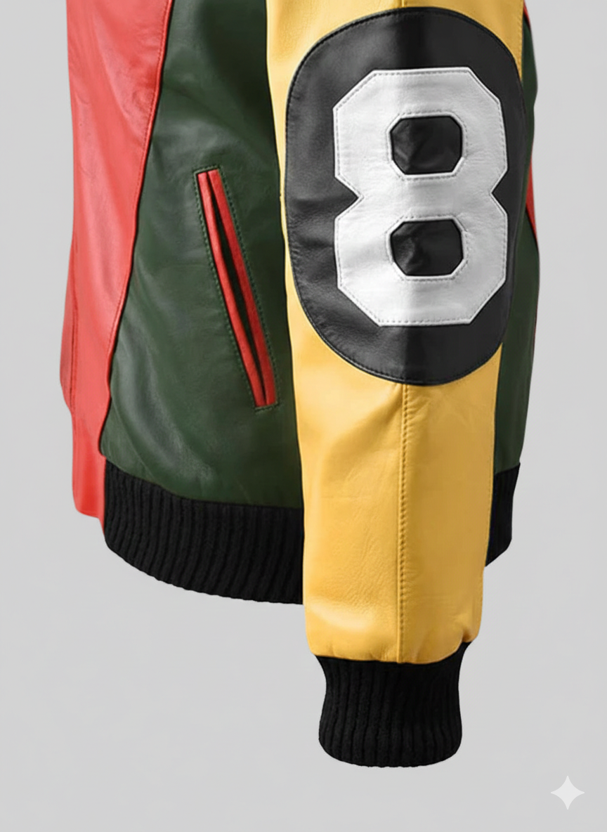 Experience a legendary piece of pop culture history with the 8 Ball Leather Jacket. This iconic outerwear gained massive fame through its association with Patrick Warburton and remains a staple for fans of vintage street style. We craft this masterpiece using premium, genuine leather to ensure it feels as good as it looks. The vibrant red, yellow, and green panels create a bold contrast that captures the retro aesthetic perfectly.