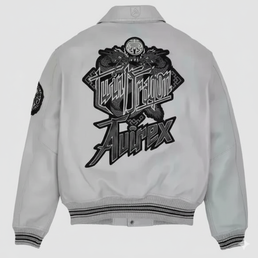 Avirex Leather Varsity Jacket Light Grey Premium Streetwear Style Description