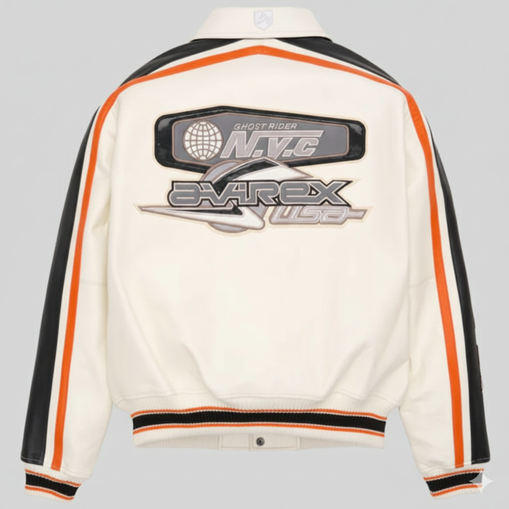 The Avirex Leather Varsity Jacket stands as a timeless piece of urban fashion, blending heritage aesthetics with modern craftsmanship. This iconic silhouette draws inspiration from classic racing and athletic gear, offering a bold look for those who appreciate high-quality Men’s Streetwear Fashion. We use premium real leather to ensure that every stitch provides durability and a soft, supple feel against the skin. The crisp white body creates a sharp contrast against the deep black sleeves, while vibrant orange piping adds a burst of energy to the overall design.