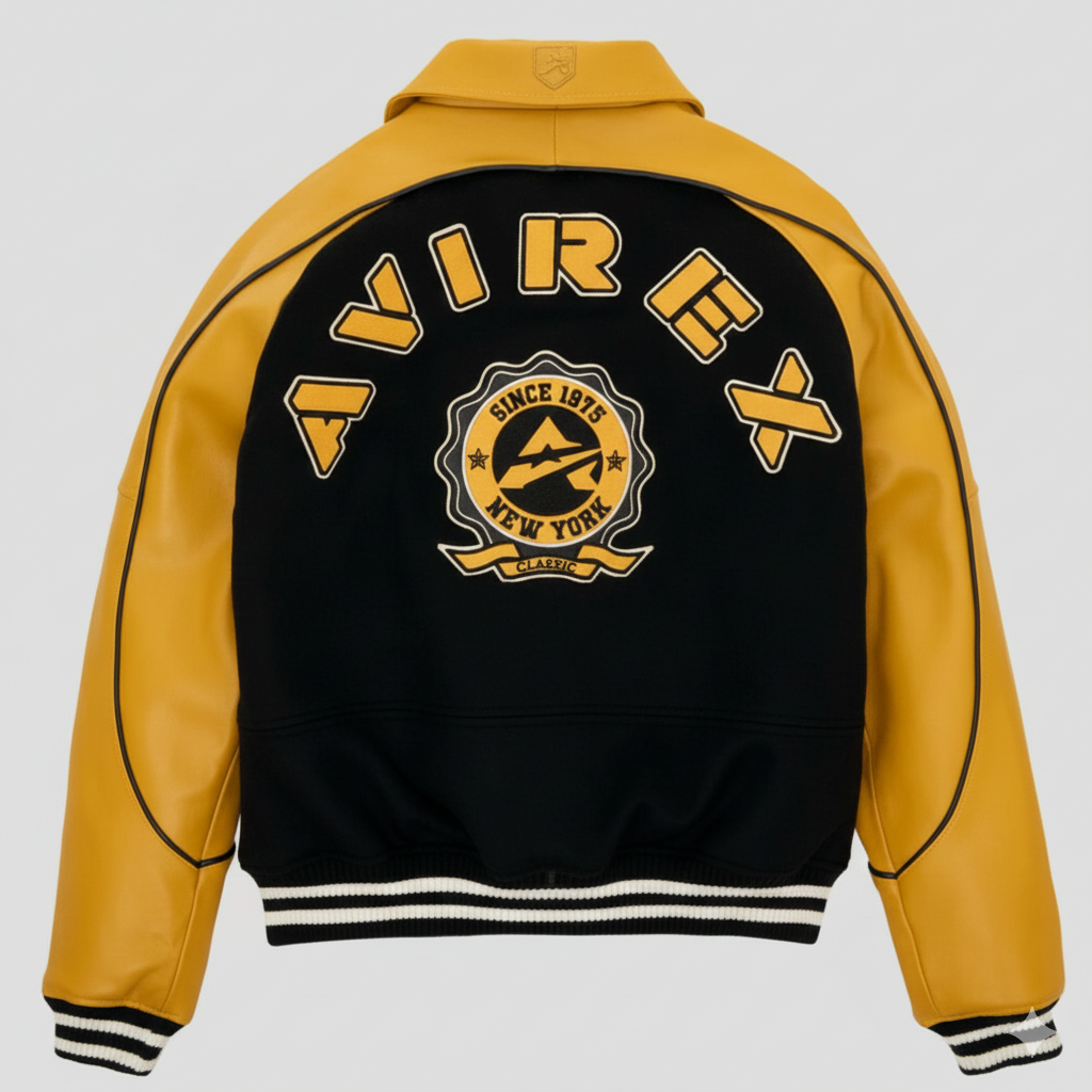 The Avirex Varsity Leather Jacket represents a perfect blend of heritage style and modern street fashion. This iconic piece features a striking contrast between deep black wool and vibrant yellow leather sleeves, creating a look that demands attention. When you wear an Avirex Varsity Leather Jacket, you are carrying a piece of aviation-inspired history combined with high-end craftsmanship. The body feels substantial yet comfortable, making it an ideal choice for cool weather and casual outings.
