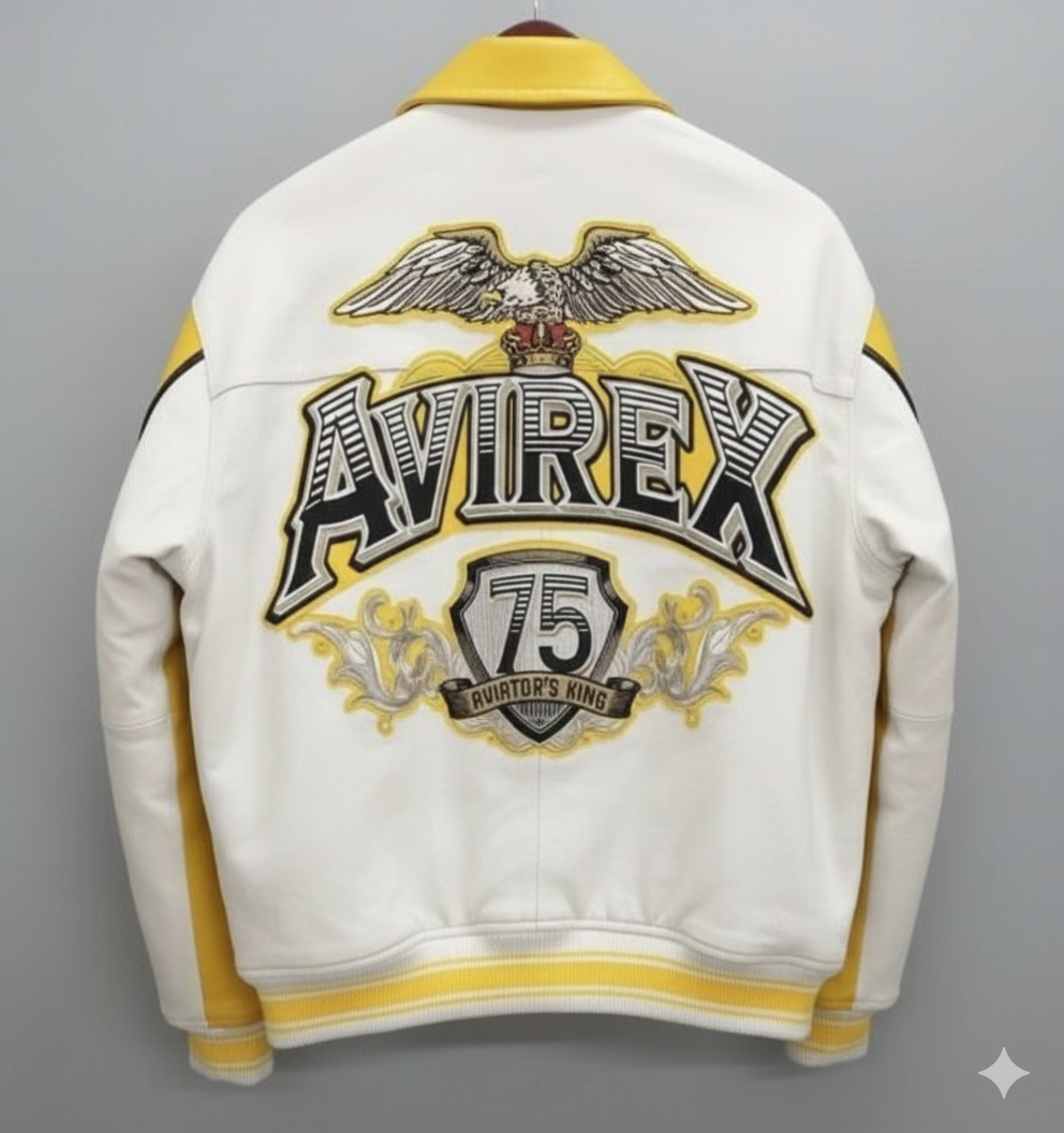Designers at Chinkara Leathers focused on the iconic aviator silhouette. It features a crisp white horizontal stripe across the chest. This stripe contrasts beautifully with the primary yellow hue. The Avirex Yellow Leather Jacket includes authentic branding details. You will find a “75” patch on the sleeve. The front also displays the classic “Aviator & Rhino” embroidery. These details pay homage to the rich heritage of flight-inspired fashion.