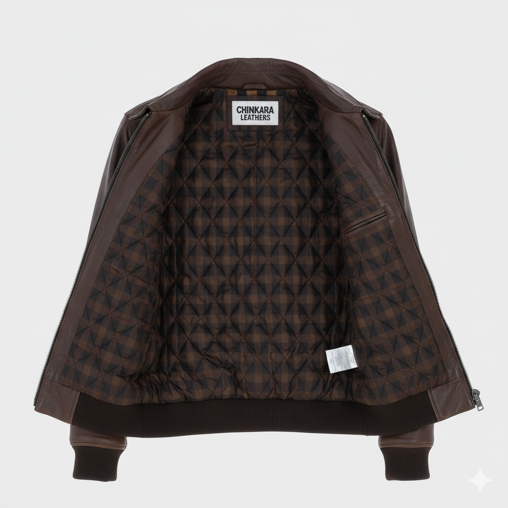 Brown Leather Bomber Jacket for Men with Quilted Check Lining Description