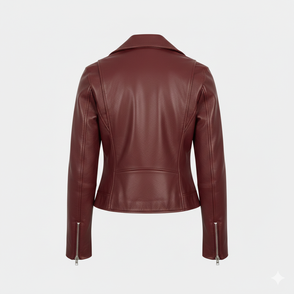 Burgundy Leather Biker Jacket Women Chic Slim Fit Genuine Skin Description