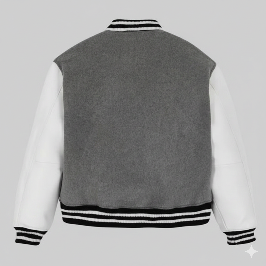 You can pair this Grey Varsity Bomber Jacket with simple denim or chinos for a classic look that works day or night. The neutral tones of the grey wool and white sleeves make it incredibly versatile for various color palettes. Every stitch reflects a commitment to quality, ensuring the jacket stands up to daily wear while maintaining its shape.