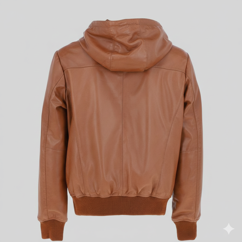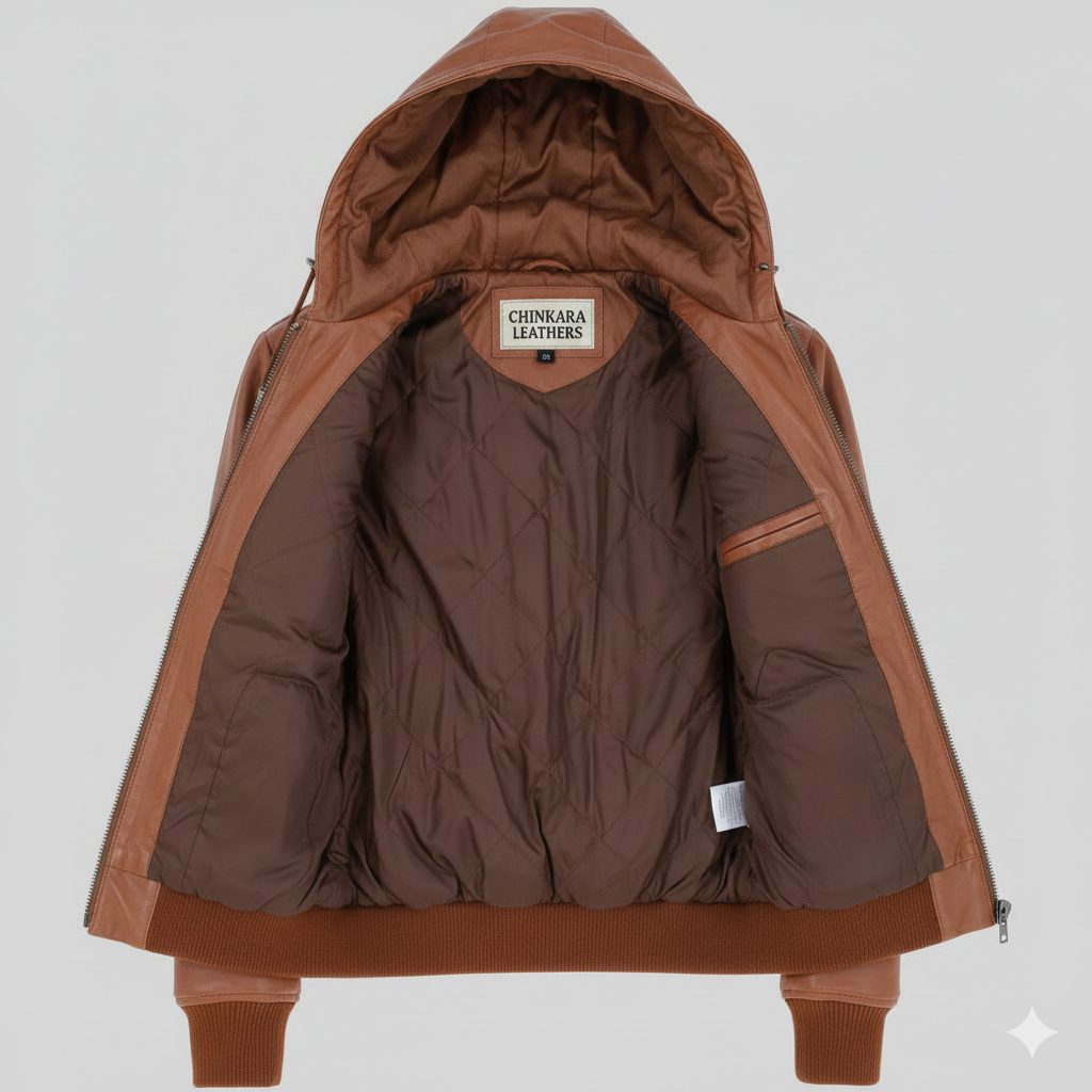Hooded Brown Leather Bomber Jacket Premium Outerwear Description