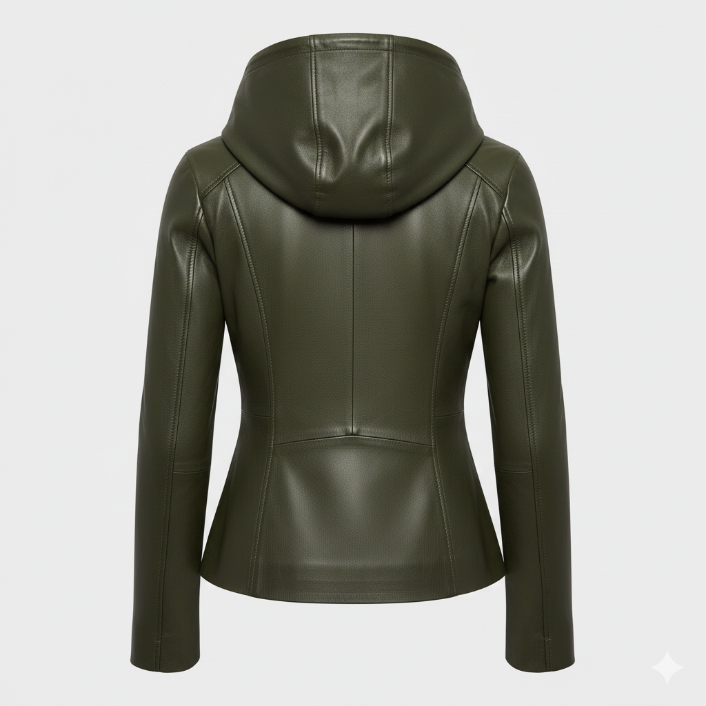 This premium Leather Hooded Jacket for Women in rich Olive Green is designed for those who value both style and modern comfort. Crafted from soft, high-quality leather, it features a sleek, stylish fit that is gently contoured to flatter the feminine silhouette. The attached leather hood is elegant and functional, blending seamlessly with the jacket’s refined structure. The monochromatic olive green color, combined with a clean metal zipper and subtle zippered hand pockets, creates an exceptionally polished look. This Leather Hooded Jacket for Women offers a versatile piece of outerwear perfect for everyday wear. Explore the superior craftsmanship and detailing that sets our products apart. Visit www.chinkaraleathers.com for more sophisticated designs. Invest in a truly stylish and durable Leather Hooded Jacket for Women today, ensuring your wardrobe stays on trend with this exceptional Leather Hooded Jacket for Women.