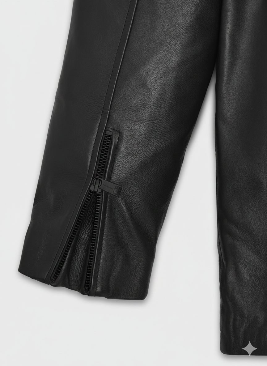 Collar Style: Sleek stand-up collar design for a modern biker aesthetic.