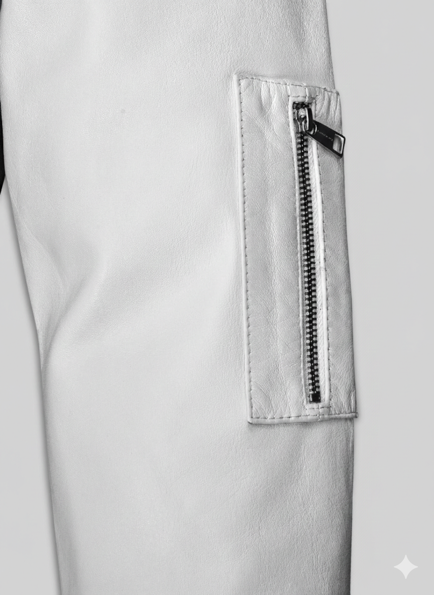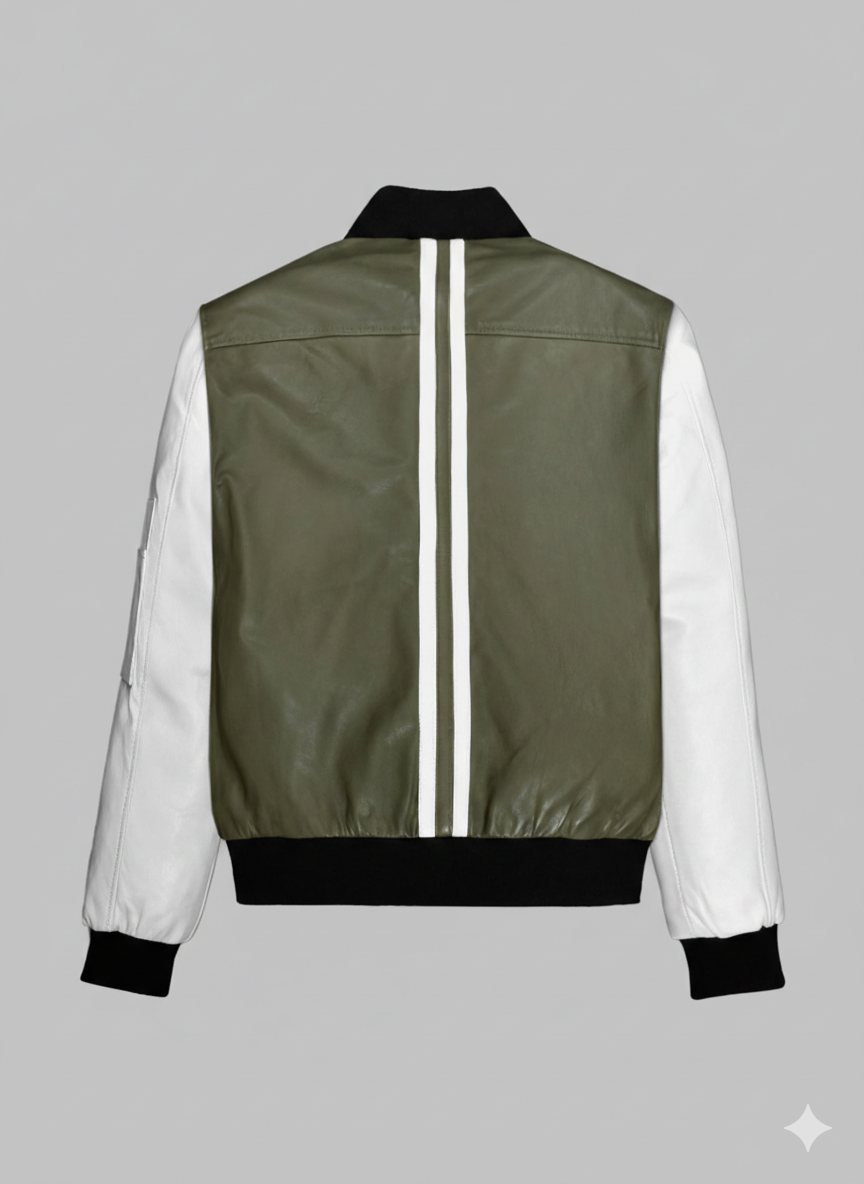 The Olive White Leather Bomber combines a rugged aesthetic with contemporary city style. This premium garment features high-quality olive green leather on the main body paired with crisp white sleeves for a striking visual contrast. We design this piece for individuals who appreciate fine craftsmanship and a unique color palette. The Olive White Leather Bomber fits comfortably over a casual t-shirt or a warm hoodie, making it a versatile choice for any season.