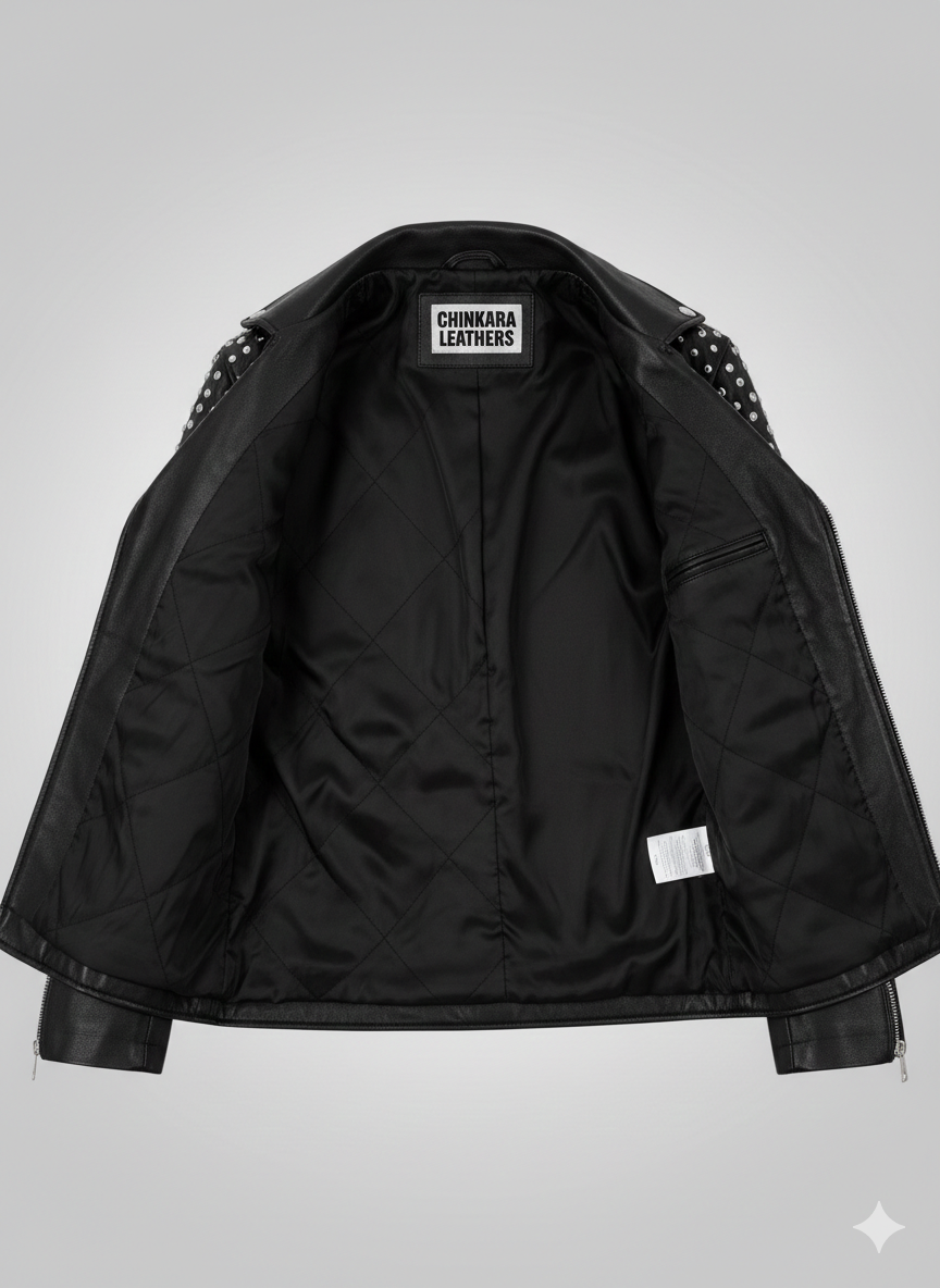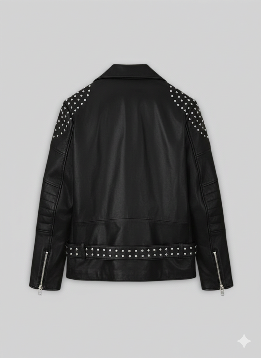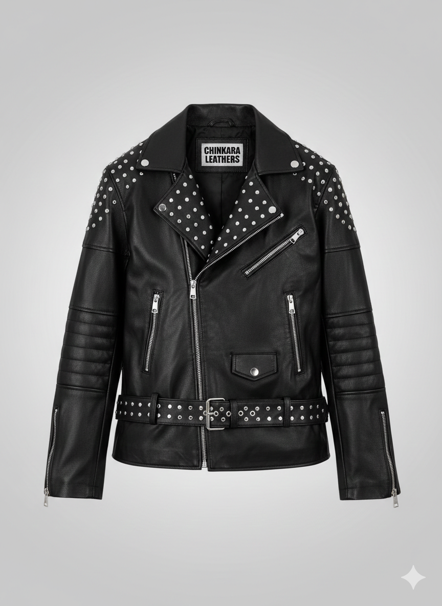 The Studded Black Leather Biker jacket stands as a bold statement piece for anyone looking to upgrade their wardrobe with an edgy, timeless look. We craft this masterpiece from high-quality lambskin to ensure a soft feel and long-lasting durability. The Studded Black Leather Biker design features meticulously placed silver studs on the shoulders and lapels, giving it a true rock-and-roll aesthetic.