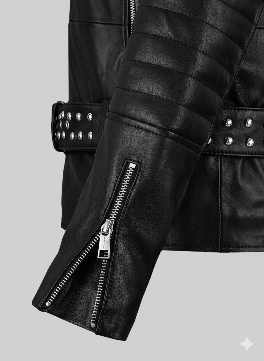 Studded Black Leather Biker Jacket with Premium Silver Hardware Description