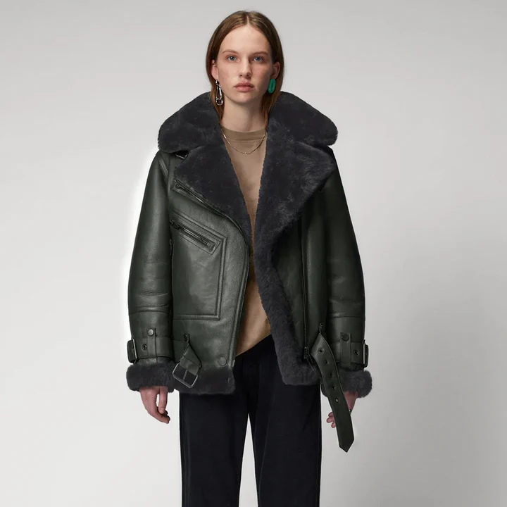 - Reengineered Shearling Moto Design: Modern oversized shearling moto style for contemporary appeal.