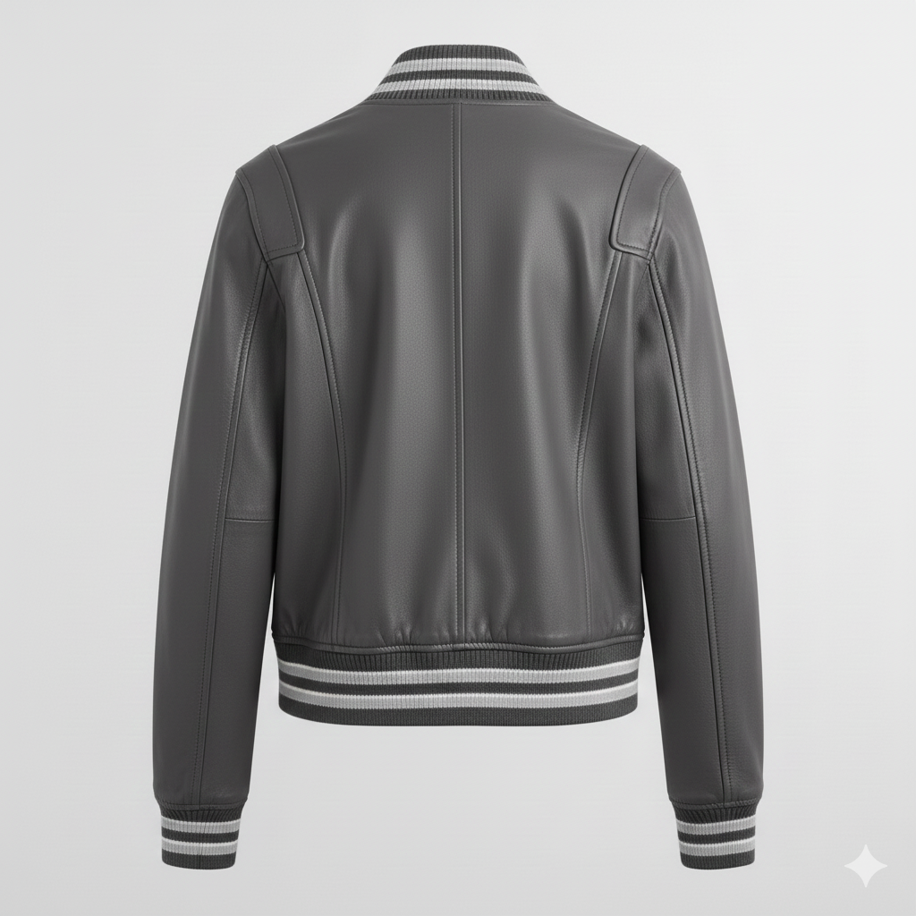 This sophisticated Women Leather Varsity Jacket in charcoal grey takes the classic collegiate letterman style and elevates it with a modern, contemporary twist. Crafted entirely from premium, smooth leather, this Women Leather Varsity Jacket features the iconic striped rib-knit collar, cuffs, and waistband, ensuring a timeless and authentic look. The fit is subtly tailored and slightly cropped, creating a structured yet feminine silhouette that flatters every body type. Designed for versatility, this Women Leather Varsity Jacket effortlessly pairs with both casual and dressy outfits, making it an essential addition to any wardrobe. Perfect for those who want to combine chic style with edgy sophistication, this Women Leather Varsity Jacket stands out as a statement piece in premium outerwear collections. Discover more exceptional designs like this Women Leather Varsity Jacket at www.chinkaraleathers.com and step up your style today!