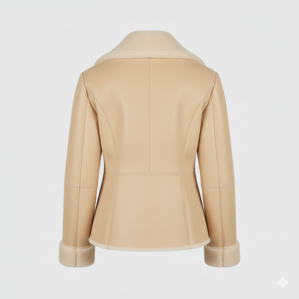 This elegant Women’s Cream Shearling Jacket is the epitome of classic winter sophistication. Crafted from warm, simple shearling, this jacket offers a soft, elegant appearance perfect for the colder months. The design features a clean cross-panel front with a subtle V-shaped seam that creates a sharp, modern, and feminine silhouette. The natural cream shearling trim on the collar, cuffs, and edges keeps the look minimal and refined. Experience luxury and warmth with this high-quality Women’s Cream Shearling Jacket. Its refined finish and precise stitching ensure durability and a premium feel. For more luxurious leather and shearling apparel, visit us at www.chinkaraleathers.com. Elevate your wardrobe with the ultimate Women’s Cream Shearling Jacket—a timeless investment in style. This Women’s Cream Shearling Jacket is the perfect addition to any stylish winter collection.